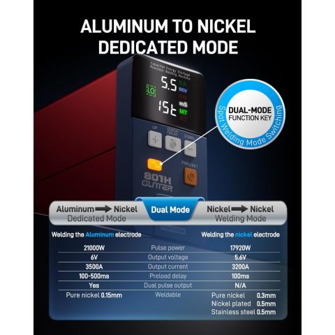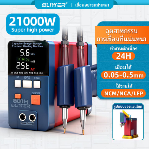GLITTER 21000W รุ่น 801H เครื่องเชื่อมแบตเตอรี่พลังงานสูง สำหรับงานเชื่อมแบตเตอรี่รถจักรยานยนต์ จักรยานไฟฟ้า แบตเตอรี่ลิเธียม 18650/21700/32650/26650 และงานเชื่อมแผ่นนิกเกิล/ทองแดงแบบมืออาชีพ มาพร้อมกำลังไฟสูงสุด 21,000W และกระแสสูงสุด 3,500A ให้รอยเชื่อมแน่น หนา แข็งแรง รองรับงานเชื่อมต่อเนื่องระดับอุตสาหกรรม เหมาะทั้งงานซ่อมบำรุงและงานผลิตแพ็คแบตเตอรี่