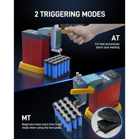 โหมด MT (Manual Trigger) – ใช้สวิตช์เท้าหรือปุ่มกดเพื่อสั่งเชื่อม เหมาะสำหรับผู้เริ่มต้น ควบคุมจังหวะได้ดี ลดการเกิดสะเก็ดไฟ