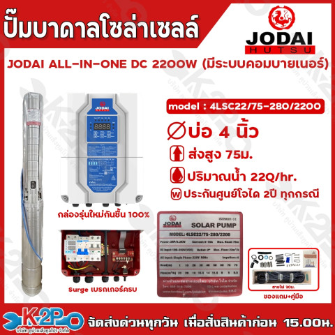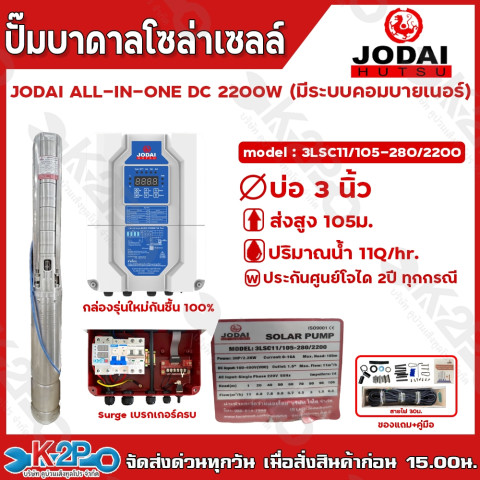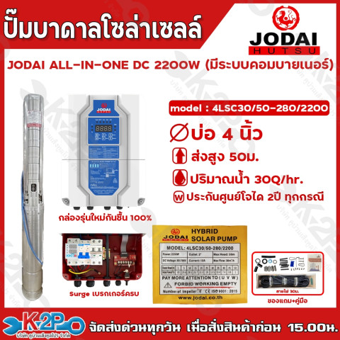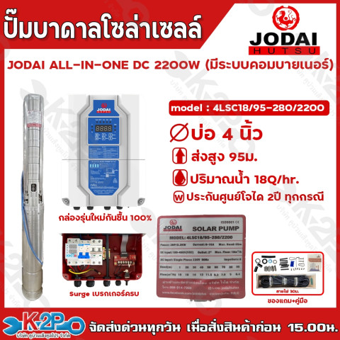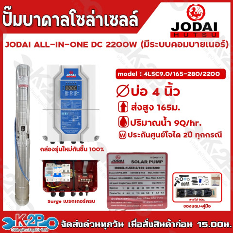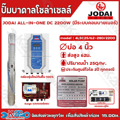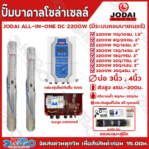 JODAI ปั๊มบาดาลโซล่าเซลล์ รุ่น ALL IN ONE DC 2200W (มีระบบคอมบายเนอร์) ตัวจบสำหรับงานสูบน้ำบาดาลบ่อ 3/4 นิ้วขึ้นไป ให้กำลังแรง สูบน้ำได้ต่อเนื่อง พร้อมกล่องคอนโทรลแบบ ALL IN ONE ที่รวมระบบคอมบายเนอร์ เบรกเกอร์ และ Surge มาให้ครบ ต่อสายพร้อมใช้งาน เหมาะทั้งงานเกษตร รดน้ำ สวน-ไร่ และงานระบบน้ำที่ต้องการความมั่นใจและประหยัดพลังงาน
