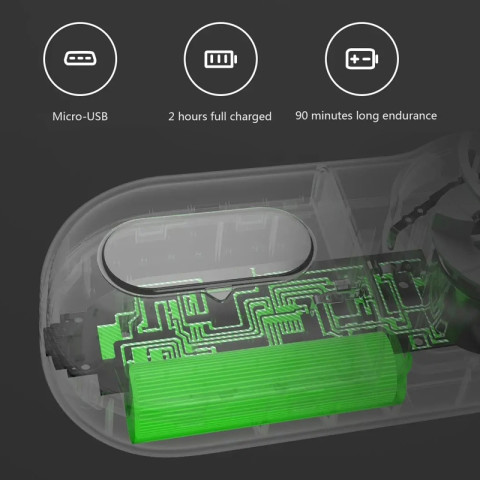 ชาร์จผ่าน USB ใช้งานง่าย ชาร์จเต็มประมาณ 2 ชั่วโมง ใช้งานต่อเนื่องได้สูงสุด 90 นาที