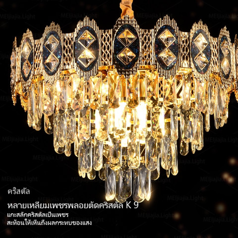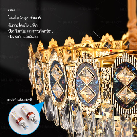วัสดุพรีเมียม: โครงเหล็กแข็งแรงเคลือบสีทอง + คริสตัลแก้วใสคุณภาพสูง ให้ความเงางามหรูหราและทนทาน