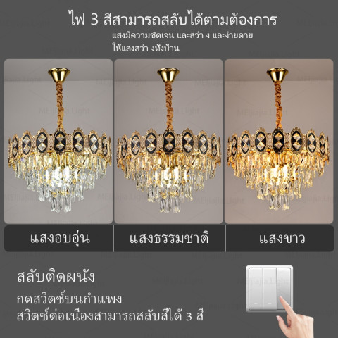 มาพร้อมฟังก์ชัน เปลี่ยนโทนแสงได้ 3 สีแบบหรี่แสง (3-Color Dimming) สลับสีแสงผ่านสวิตช์ไฟที่ผนัง (ไม่รวมสวิตช์ผนัง) ให้คุณเลือกบรรยากาศได้ตามต้องการ ทั้งแสงขาว แสงขาวนวล และแสงเหลือง เหมาะทั้งสำหรับการใช้งานทั่วไปและสร้างบรรยากาศโรแมนติกหรูหราในมื้อค่ำหรือช่วงพักผ่อน