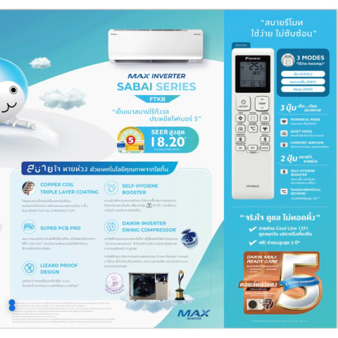 ด้วยเทคโนโลยีอินเวอร์เตอร์รุ่นใหม่ล่าสุดจาก DAIKIN ช่วยให้เครื่องทำงานเงียบ เย็นเร็ว ควบคุมอุณหภูมิได้อย่างแม่นยำ พร้อมน้ำยา R32 ที่เป็นมิตรต่อสิ่งแวดล้อม และให้ประสิทธิภาพการทำความเย็นสูง เหมาะกับสภาพอากาศร้อนของเมืองไทยตลอดทั้งปี