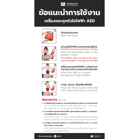 มีคำแนะนำภาษาไทยติดอยู่บนตัวตู้ เหมาะสำหรับผู้ที่ไม่คุ้นเคยกับการใช้เครื่อง AED ช่วยให้ปฏิบัติตามขั้นตอนเบื้องต้นได้อย่างเป็นระบบเมื่อต้องช่วยชีวิตผู้ป่วยฉุกเฉินเหมาะสำหรับองค์กรและอาคารทุกประเภท