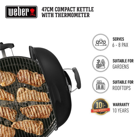 สัมผัสประสบการณ์บาร์บีคิวระดับมือโปรได้ง่าย ๆ ที่บ้านด้วย WEBER BBQ Compact Kettle Charcoal Grill 47cm เตาถ่านปิ้งย่างเวเบอร์ เตาปิ้งย่างถ่านดีไซน์กะทัดรัดแต่ทรงพลัง เหมาะทั้งใช้ที่สวนหลังบ้าน ระเบียง หรือดาดฟ้า ให้คุณสนุกกับปาร์ตี้บาร์บีคิวกับเพื่อนและครอบครัวได้อย่างเต็มอารมณ์ รองรับการย่างได้ประมาณ 6–8 ที่ในครั้งเดียว