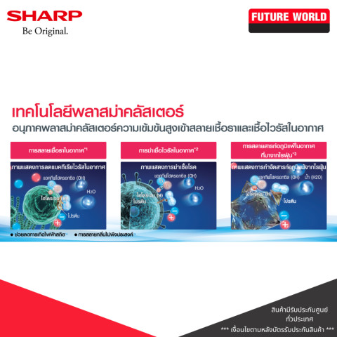 ระบบ Plasmacluster เข้มข้น ปล่อยประจุบวกและลบ ช่วยยับยั้งเชื้อโรค เชื้อรา แบคทีเรีย และไวรัสในอากาศ