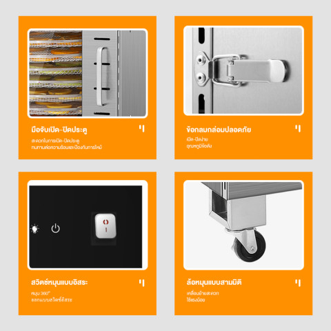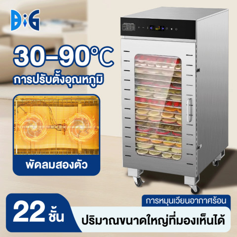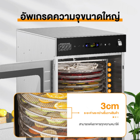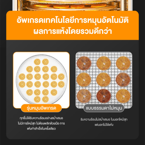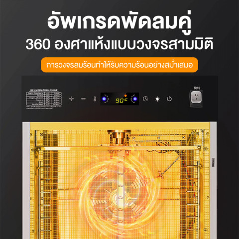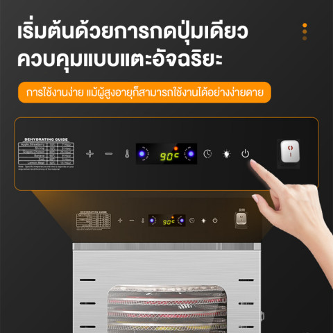 ควบคุมง่ายด้วยหน้าจอสัมผัสอัจฉริยะ ปรับอุณหภูมิได้ตั้งแต่ 30–90°C และตั้งเวลาได้สูงสุดถึง 24 ชั่วโมง พร้อมระบบลมร้อนหมุนเวียน 360 องศา ทำให้อาหารแห้งสม่ำเสมอทุกชั้นทุกมุม โดยยังคงสี กลิ่น และรสชาติของวัตถุดิบไว้ได้อย่างดี