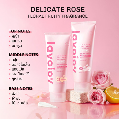บอดี้เซรั่มโทนอัพ ที่ช่วยปรับโทนผิวให้ดูกระจ่างใส เรียบเนียนทันทีที่ใช้ พร้อมบำรุงลึกและช่วยปกป้องผิวจากรังสี UV ในขั้นตอนเดียว มอบผิวโกลว์สุขภาพดี หอมกลิ่นกุหลาบละมุนแบบ Delicate Rose