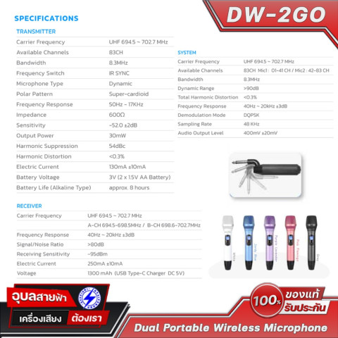 ทนทานและคมชัดด้วยไมโครโฟนไดนามิกลักษณะรับเสียง Super-cardioid (50Hz–17kHz) พร้อมอัตราส่วนสัญญาณต่อเสียงรบกวน >80dB และค่า THD ต่ำกว่า 0.3% มั่นใจในเสียงคมใสทุกครั้งที่ถือขึ้นพูดหรือร้อง ราคาเพียง 5,800 บาท ทำให้ DW-2GO เป็นตัวเลือกคุ้มค่าสำหรับมืออาชีพและผู้ใช้งานทั่วไป