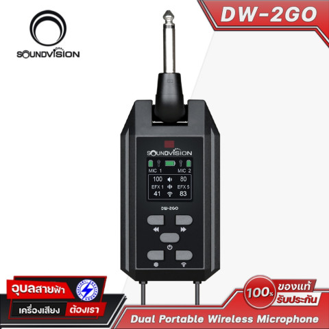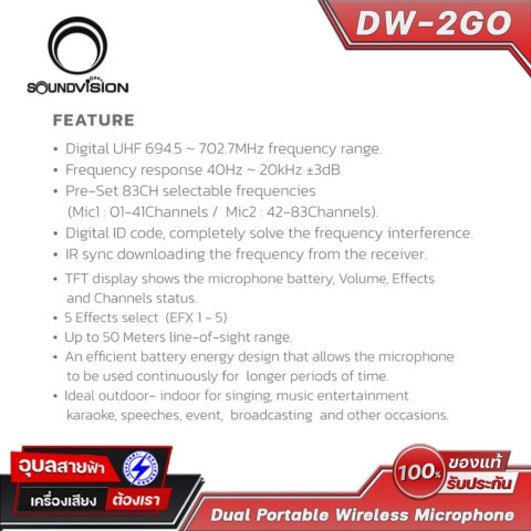 SoundVision DW-2GO ไมโครโฟนดิจิตอลไร้สายมือถือคู่ที่มอบความยืดหยุ่นสูงสุดให้ทุกกิจกรรม ตั้งแต่ร้องเพลง คาราโอเกะ ไปจนถึงงานอีเวนต์กลางแจ้ง ด้วยระบบ UHF ดิจิตอล 694.5–702.7 MHz และเทคโนโลยี IR Sync ที่จัดการความถี่ได้ถึง 84 ช่อง จึงเปลี่ยนการจัดงานให้ลื่นไหล ไม่มีสัญญาณรบกวน