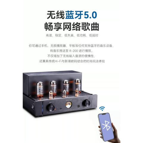 ดื่มด่ำกับเสน่ห์เสียงจากแอมป์หลอดระดับออดิโอไฟล์ Willsenton R200 (BT.50) แอมป์หลอดสเตอริโอ 32 วัตต์ (RMS) ต่อแชนแนล ที่ผสานความคลาสสิกของหลอดสุญญากาศเข้ากับเทคโนโลยี Bluetooth 5.0 ชิป QCC3034 รองรับ aptX, aptX HD, aptX Low Latency, SBC และ AAC ให้คุณได้ทั้งคุณภาพเสียงอนาล็อกอันอบอุ่น และความสะดวกสบายการสตรีมเพลงไร้สายระดับ Hi-Fi ในเครื่องเดียว