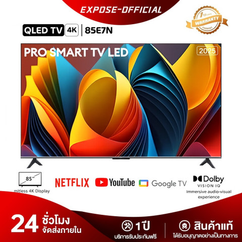 Expose Pro TV Smart TV 4K LED ทีวีจอแบนระบบสมาร์ททีวีที่มาพร้อมความคมชัดระดับ 4K และสัดส่วนภาพ 16:9 ให้ภาพสวยคม สีสันมีมิติ เหมาะทั้งดูหนัง ดูซีรีส์ และความบันเทิงในบ้านแบบเต็มอารมณ์ รองรับการใช้งานอินเทอร์เน็ตผ่าน WiFi พร้อมแอปยอดนิยมที่ติดตั้งมาให้ เช่น Netflix / YouTube / Chrome / Aptoide TV ใช้งานได้ทันที